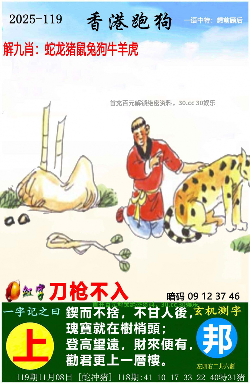 新版跑狗诗 122期:新版跑狗一字記之曰【窄】 分出輕重,豈将容易 左右香童不识君 玄機測字:《悖》 一語中特:愤发有为 老版跑狗诗 122期老版跑狗一字記之曰:【積】 詩雲:忆当时纹衾粲枕,直入千山万山去 先求積福,再求利禄。灵宫旧是栖真处! 老而不死,壽則多辱。马嘶静谷声偏响! 玄機測字:《煌》 另版跑狗诗 122期另版跑狗一字記之曰:【錢】 縱是銅臭,誰也低頭。甘爲錢幣做馬牛。 營營役役,爲稻梁謀。誰棄溫飽換自由。 红字暗码 122期信箱红字:揭竿四起 信箱暗码:19 22 30 43 |
